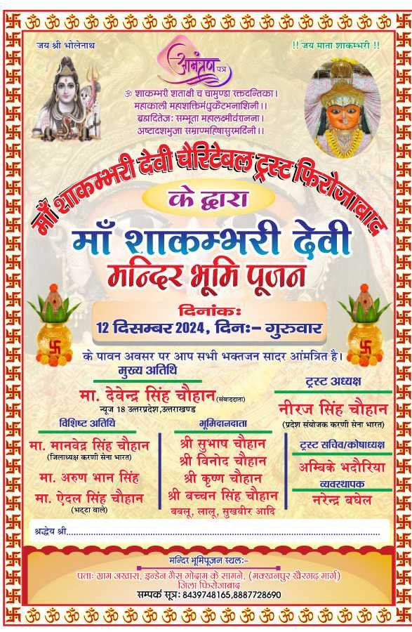 माँ शाकंम्भरी देवी चैरिटेबल ट्रस्ट भूमि पूजन कार्ड